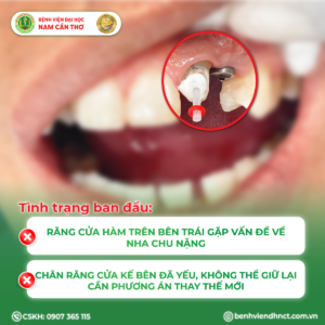 35 tuổi, răng cửa lung lay nhưng anh trì hoãn 2 năm vì nghĩ implant phải trả một lần 30-40 triệu. Đến khi nướu sưng, anh mới tìm đến Trung tâm Nha khoa – Bệnh viện Đại học Nam Cần Thơ với tình trạng: