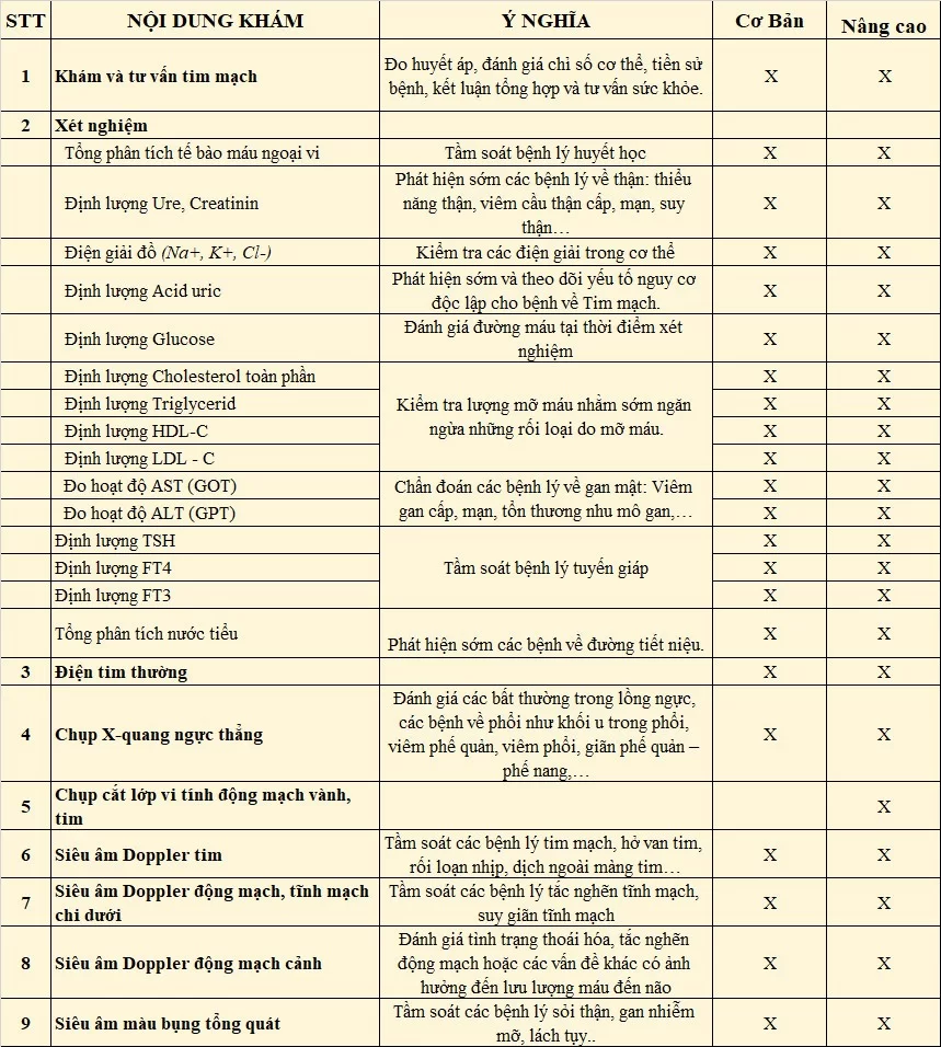 Với mục tiêu chăm sóc sức khỏe toàn diện, tận tâm cho mọi đối tượng từ lúc còn trong bào thai đến khi sinh ra, trưởng thành và lúc về già, Bệnh viện Đại học Nam Cần Thơ triển khai các gói khám tầm soát bệnh tim mạch cơ bản và nâng cao. Chi tiết gói khám bao gồm: