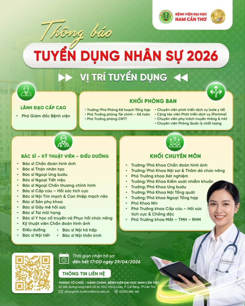 Dựa trên những nghiên cứu và thăm khám thực tế, các bác sĩ chuyên khoa Tim mạch – Bệnh viện Đại học Nam Cần Thơ đã xây dựng gói khám tầm soát bệnh lý tim mạch giúp phòng ngừa và phát hiện sớm các bệnh lý tim mạch, chung tay cùng cộng đồng vì một trái tim khỏe mạnh. Để biết thêm chi tiết về gói thăm khám, vui lòng liên hệ với Bệnh viện Đại học Nam Cần Thơ thông qua tổng đài CSKH: 0907.365.115.