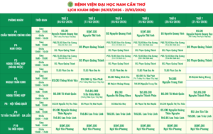 Nhằm giúp người bệnh thuận tiện hơn trong việc sắp xếp thời gian thăm khám, Bệnh viện Đại học Nam Cần Thơ xin thông báo lịch làm việc của các bác sĩ tại các phòng khám chuyên khoa. Với đội ngũ y bác sĩ giàu kinh nghiệm, trang thiết bị hiện đại, chúng tôi cam kết mang đến dịch vụ chất lượng với phương châm “Thân thiện – Tận tâm và Nâng tầm sức khỏe”.