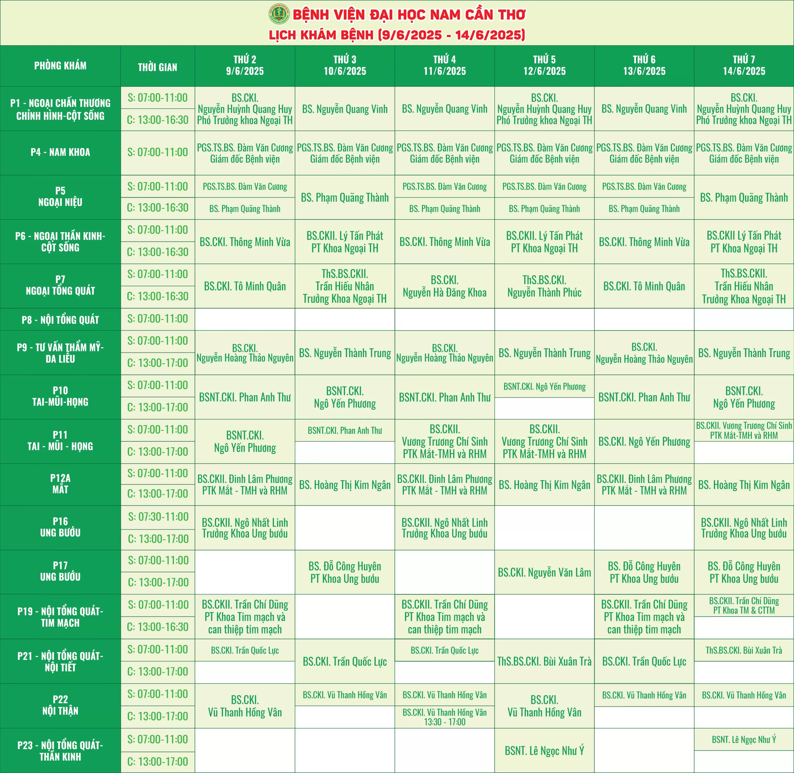 Nhằm giúp người bệnh thuận tiện hơn trong việc sắp xếp thời gian thăm khám, Bệnh viện Đại học Nam Cần Thơ xin thông báo lịch làm việc của các bác sĩ tại các phòng khám chuyên khoa. Với đội ngũ y bác sĩ giàu kinh nghiệm, trang thiết bị hiện đại, chúng tôi cam kết mang đến dịch vụ chất lượng với phương châm “Thân thiện – Tận tâm và Nâng tầm sức khỏe”.