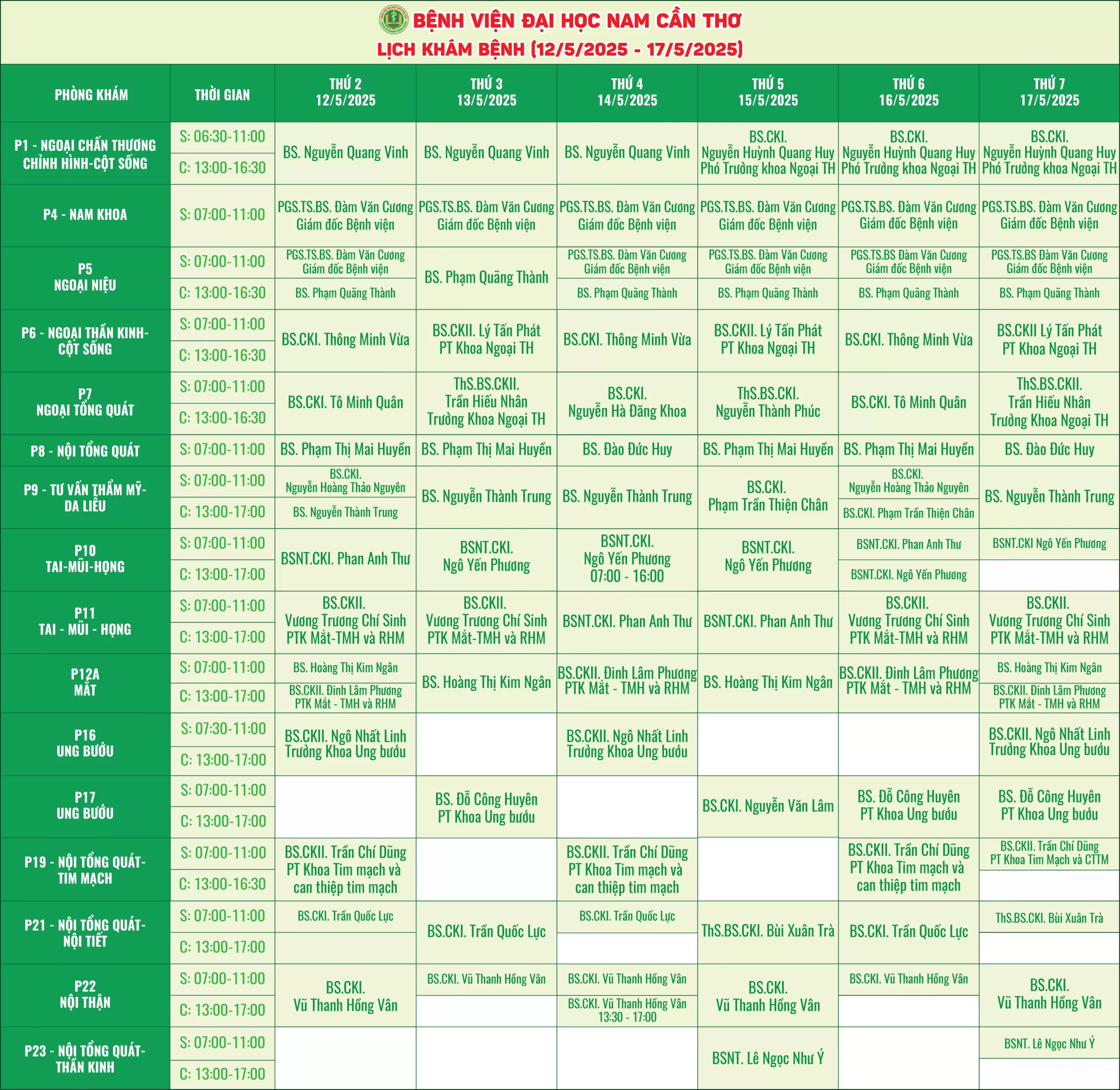 Nhằm giúp người bệnh thuận tiện hơn trong việc sắp xếp thời gian thăm khám, Bệnh viện Đại học Nam Cần Thơ xin thông báo lịch làm việc của các bác sĩ tại các phòng khám chuyên khoa. Với đội ngũ y bác sĩ giàu kinh nghiệm, trang thiết bị hiện đại, chúng tôi cam kết mang đến dịch vụ chất lượng với phương châm “Thân thiện – Tận tâm và Nâng tầm sức khỏe”.