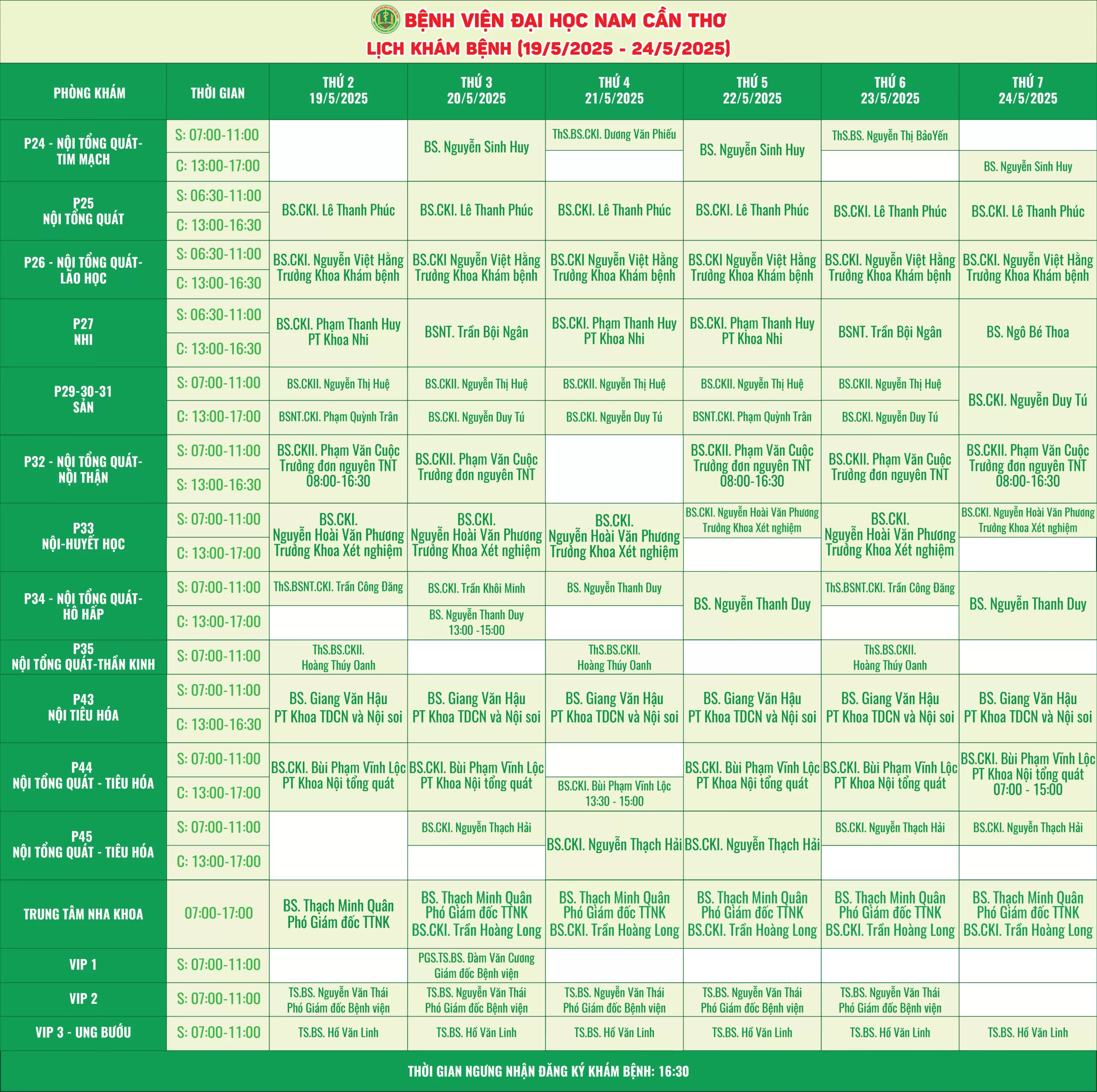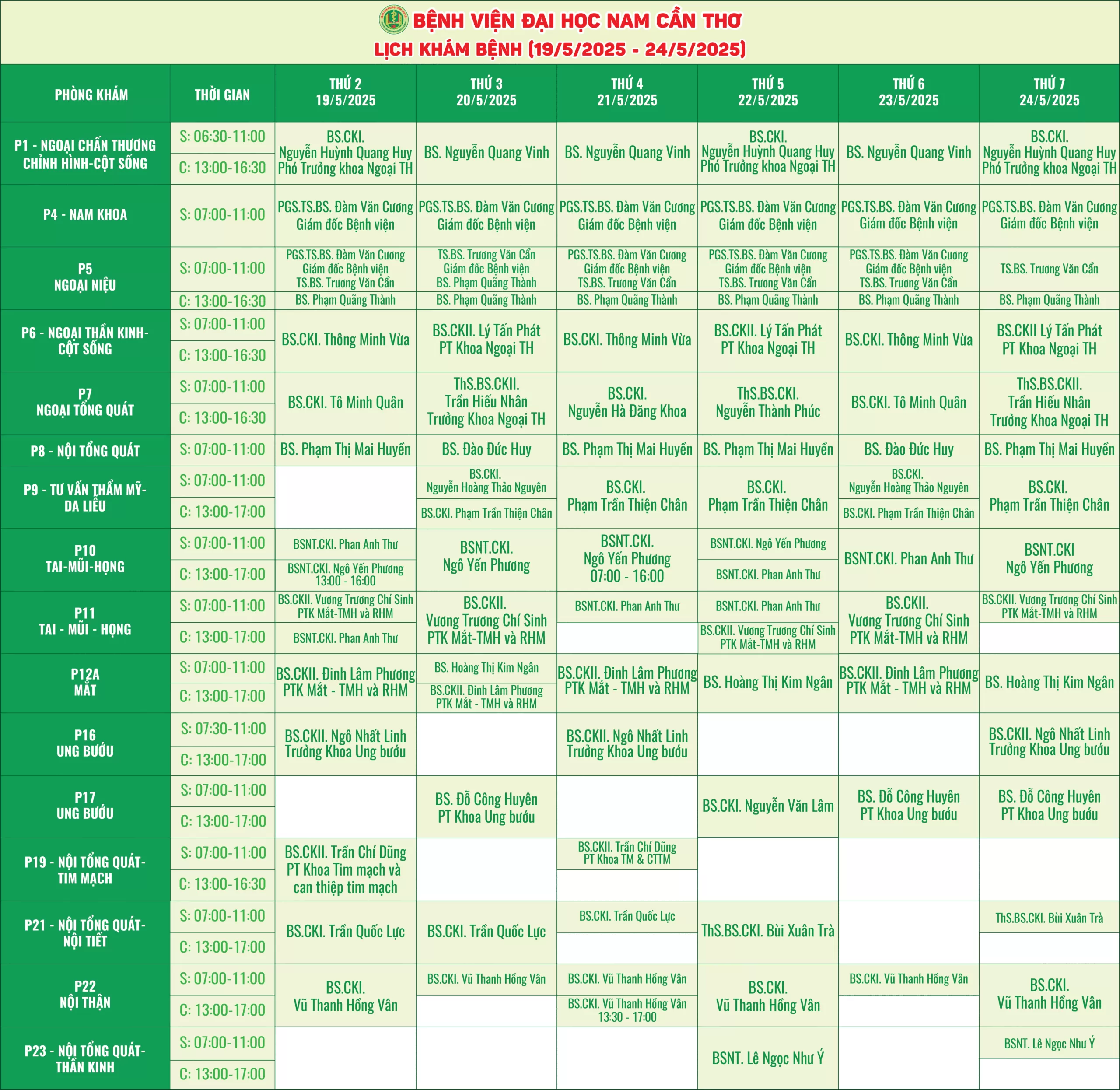 LỊCH KHÁM CỦA CÁC BÁC SĨ TẠI BỆNH VIỆN ĐẠI HỌC NAM CẦN THƠ 19/05/2025-24/05/2025