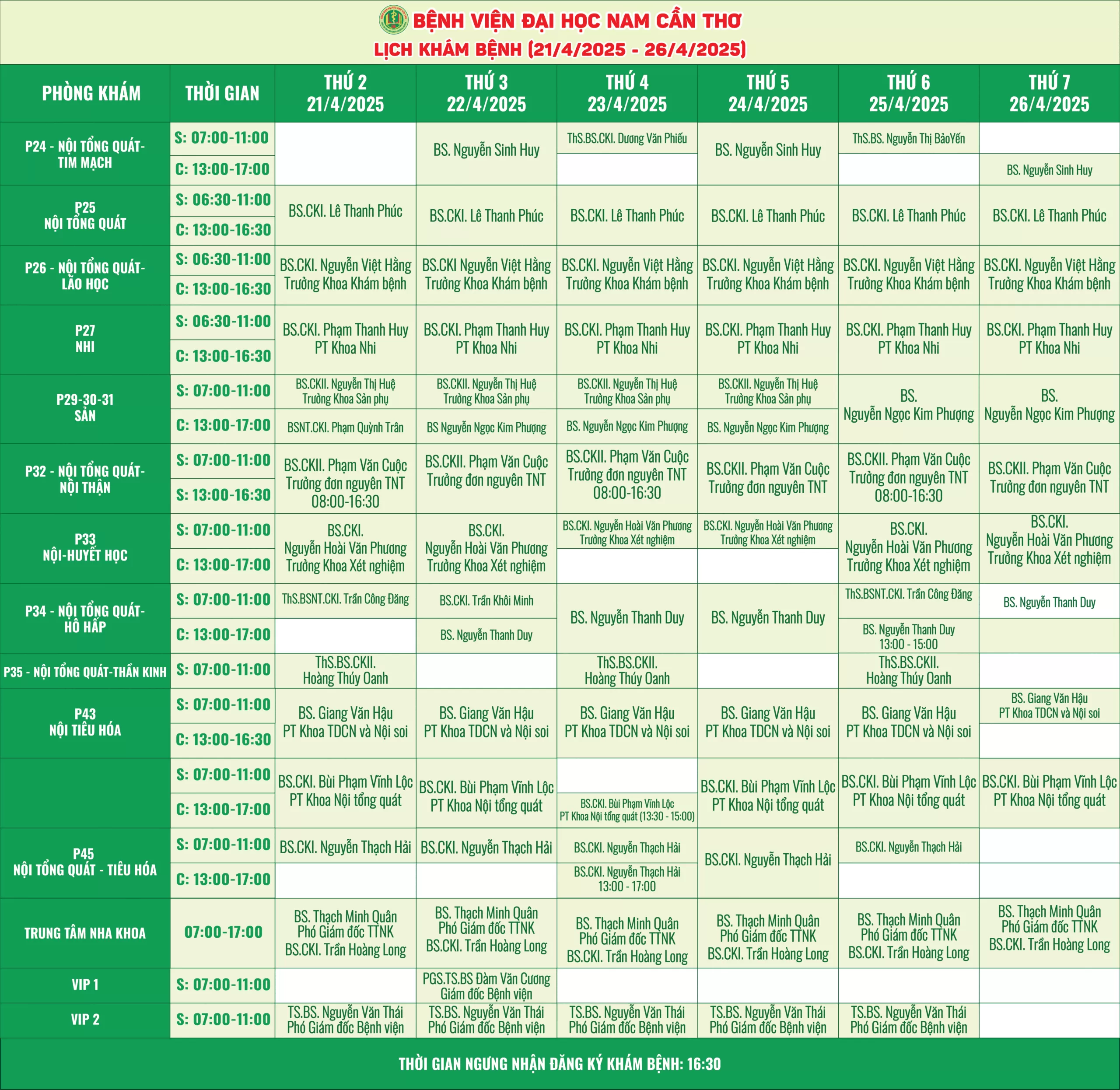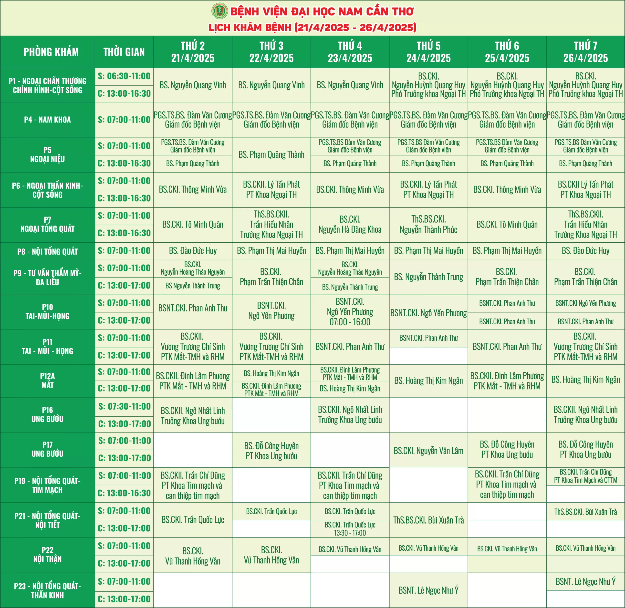 Nhằm giúp người bệnh thuận tiện hơn trong việc sắp xếp thời gian thăm khám, Bệnh viện Đại học Nam Cần Thơ xin thông báo lịch làm việc của các bác sĩ tại các phòng khám chuyên khoa. Với đội ngũ y bác sĩ giàu kinh nghiệm, trang thiết bị hiện đại, chúng tôi cam kết mang đến dịch vụ chất lượng với phương châm “Thân thiện – Tận tâm và Nâng tầm sức khỏe”.