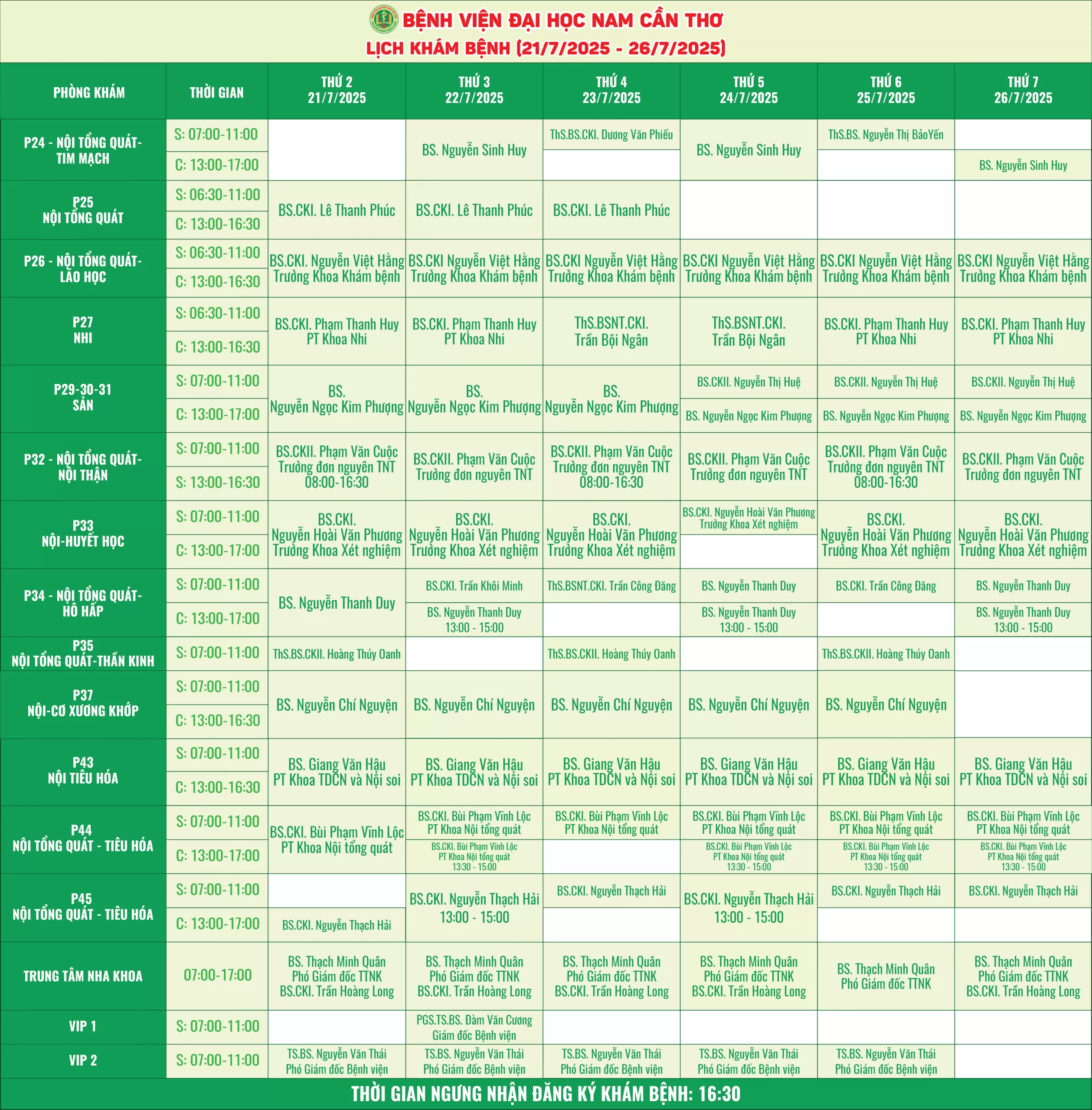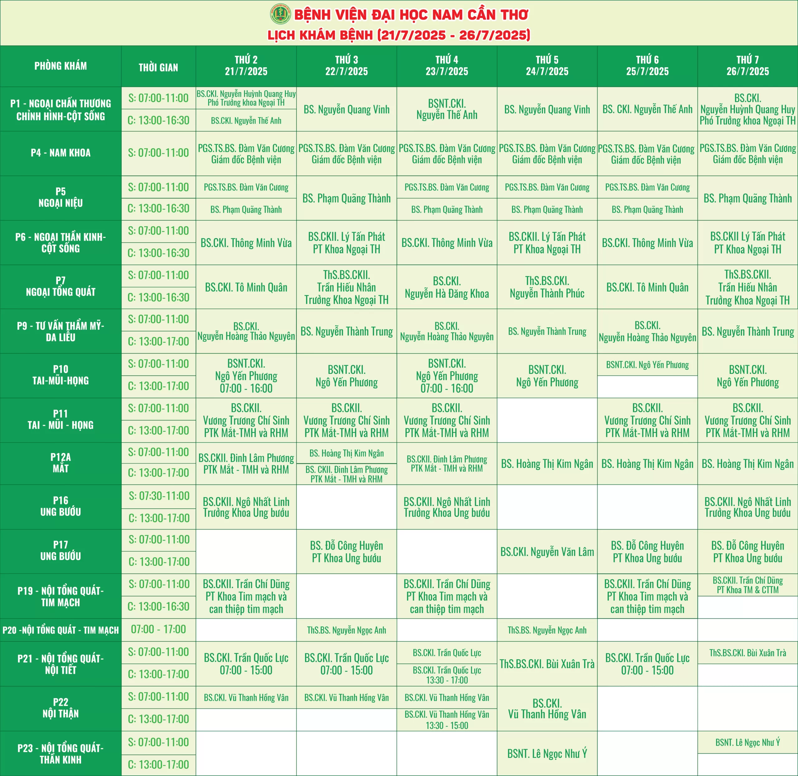 Nhằm giúp người bệnh thuận tiện hơn trong việc sắp xếp thời gian thăm khám, Bệnh viện Đại học Nam Cần Thơ xin thông báo lịch làm việc của các bác sĩ tại các phòng khám chuyên khoa. Với đội ngũ y bác sĩ giàu kinh nghiệm, trang thiết bị hiện đại, chúng tôi cam kết mang đến dịch vụ chất lượng với phương châm “Thân thiện – Tận tâm và Nâng tầm sức khỏe”.
