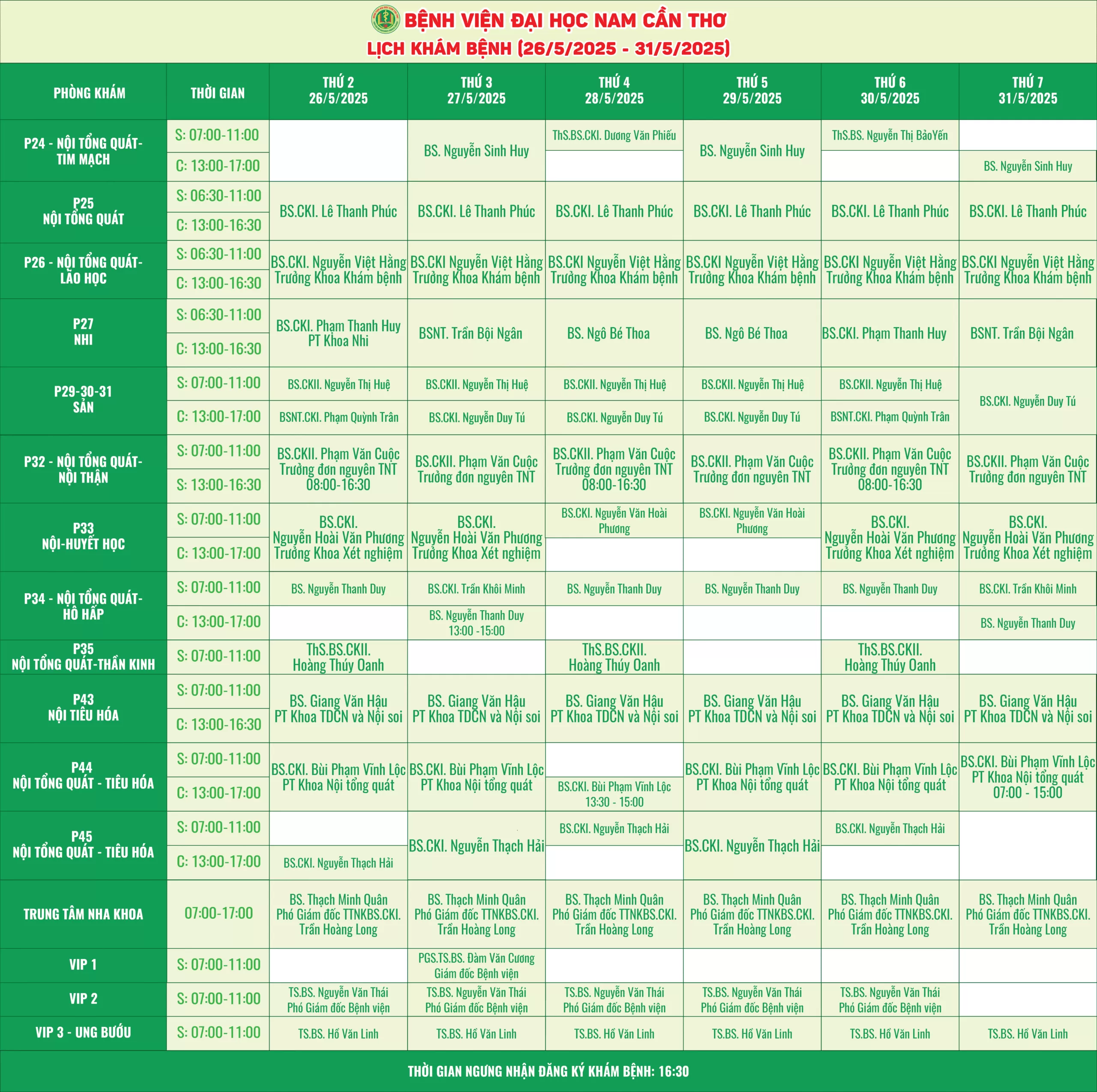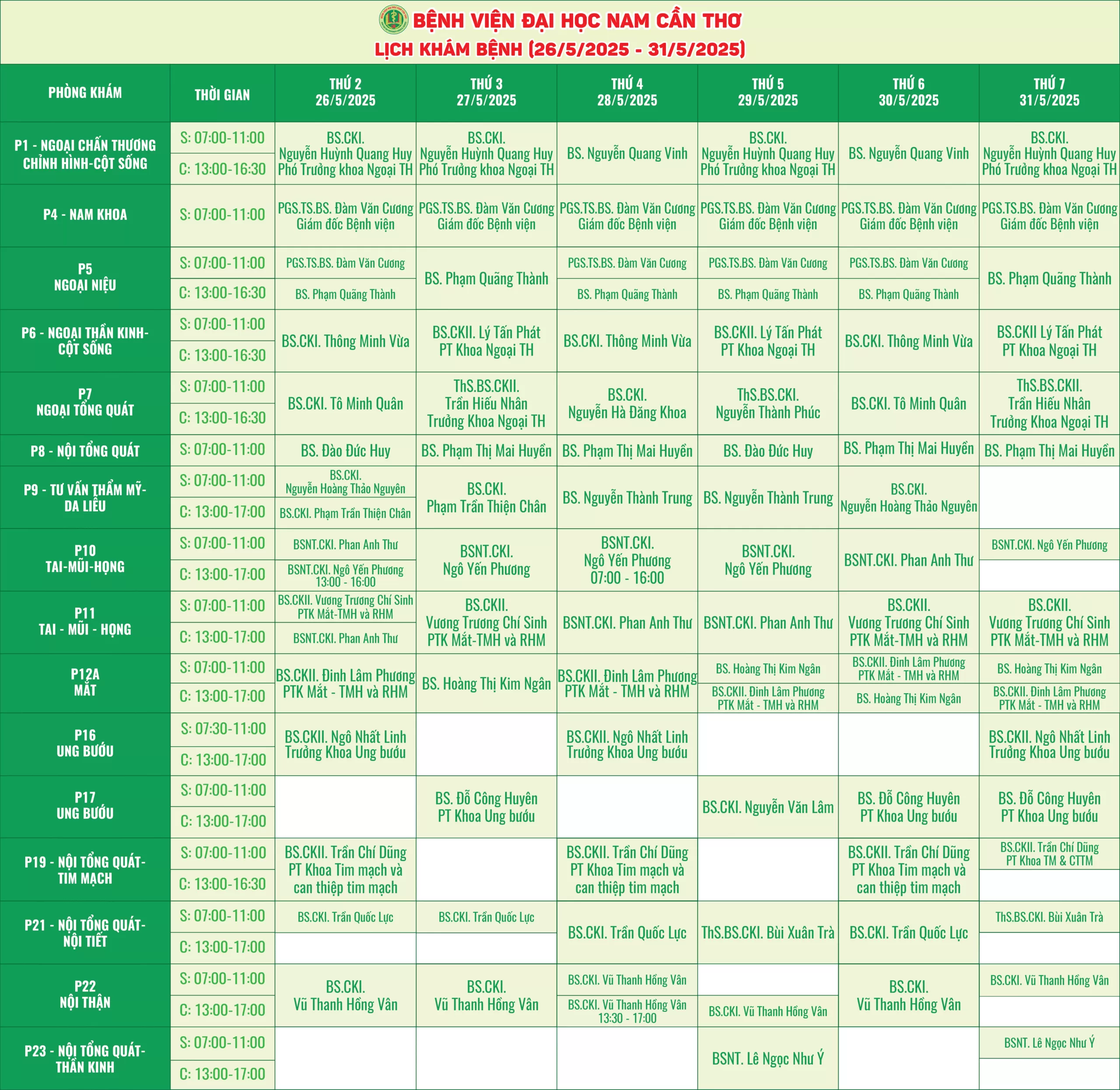 Nhằm giúp người bệnh thuận tiện hơn trong việc sắp xếp thời gian thăm khám, Bệnh viện Đại học Nam Cần Thơ xin thông báo lịch làm việc của các bác sĩ tại các phòng khám chuyên khoa. Với đội ngũ y bác sĩ giàu kinh nghiệm, trang thiết bị hiện đại, chúng tôi cam kết mang đến dịch vụ chất lượng với phương châm “Thân thiện – Tận tâm và Nâng tầm sức khỏe”.