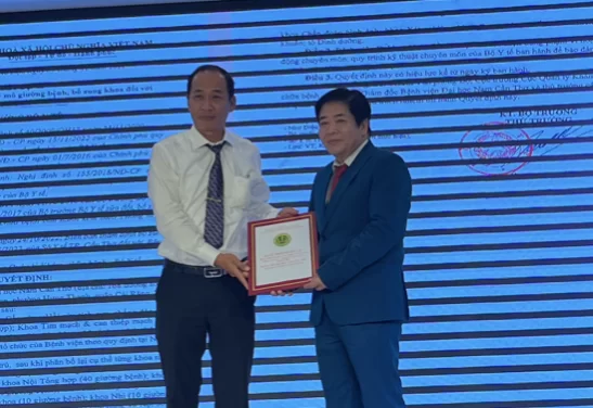 PGS.TS.BS Đàm Văn Cương (phải), Giám đốc Bệnh viện ĐH Nam Cần Thơ, nhận quyết định thành lập các khoa mới