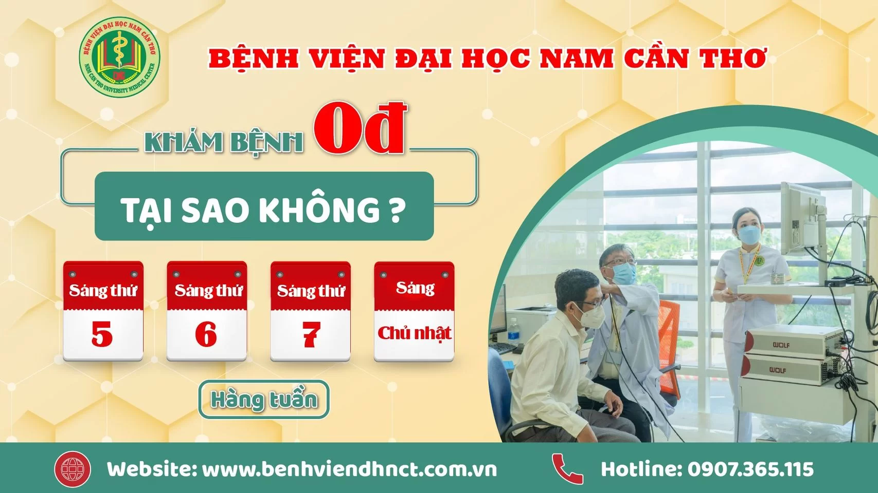 Lịch khám bệnh miễn phí (công khám bệnh) sẽ được thực hiện vào các buổi Sáng: Thứ 5, Thứ 6, Thứ 7 và Chủ nhật hàng tuần (riêng sáng chủ nhật khám chuyên khoa nội và ngoại).