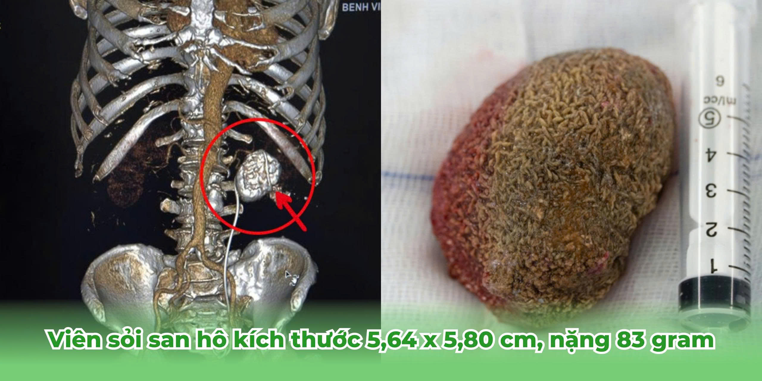 Tại đây, Sau khi hội chẩn chuyên khoa PGS.TS.BS. Đàm Văn Cương phối hợp cùng BS. Phạm Quãng Thành và ê-kíp gây mê hồi sức phẫu thuật lấy sỏi. Quá trình phẫu thuật diễn ra rất thuận lợi, viên sỏi san hô được lấy trọn với (KÍCH THƯỚC 5,64 cm x 5,80 cm, KHỐI LƯỢNG nặng 83,848 gram). Đáng chú ý, bệnh nhân có dấu hiệu nhiễm khuẩn đường tiết niệu, gia tăng nguy cơ suy giảm chức năng thận. Bên cạnh đó, bệnh nhân có tiền sử bệnh lý nền gồm đái tháo đường và tăng huyết áp, làm phức tạp thêm quá trình phẫu thuật.