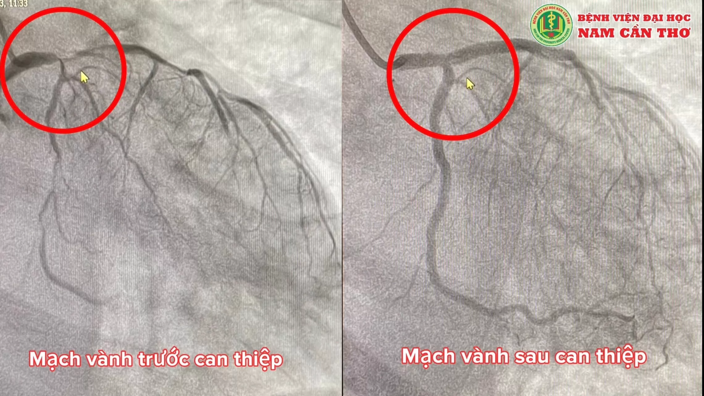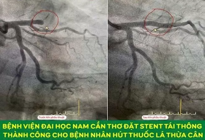 Một trường hợp nữa là cụ ông 80 tuổi, bị nhồi máu cơ tim cấp không ST chênh lên. Ông bị hẹp nặng 2 mạch máu chính. Nhánh LAD hẹp dài lần tỏa, Calci hóa nặng, mạch máu xoắn vặn. Nhánh LCx hẹp nặng từ lỗ xuất phát. Ông được can thiệp đặt 3 stent (2 stent LAD, 1 stent LCx) mạch máu tái thông hoàn toàn.