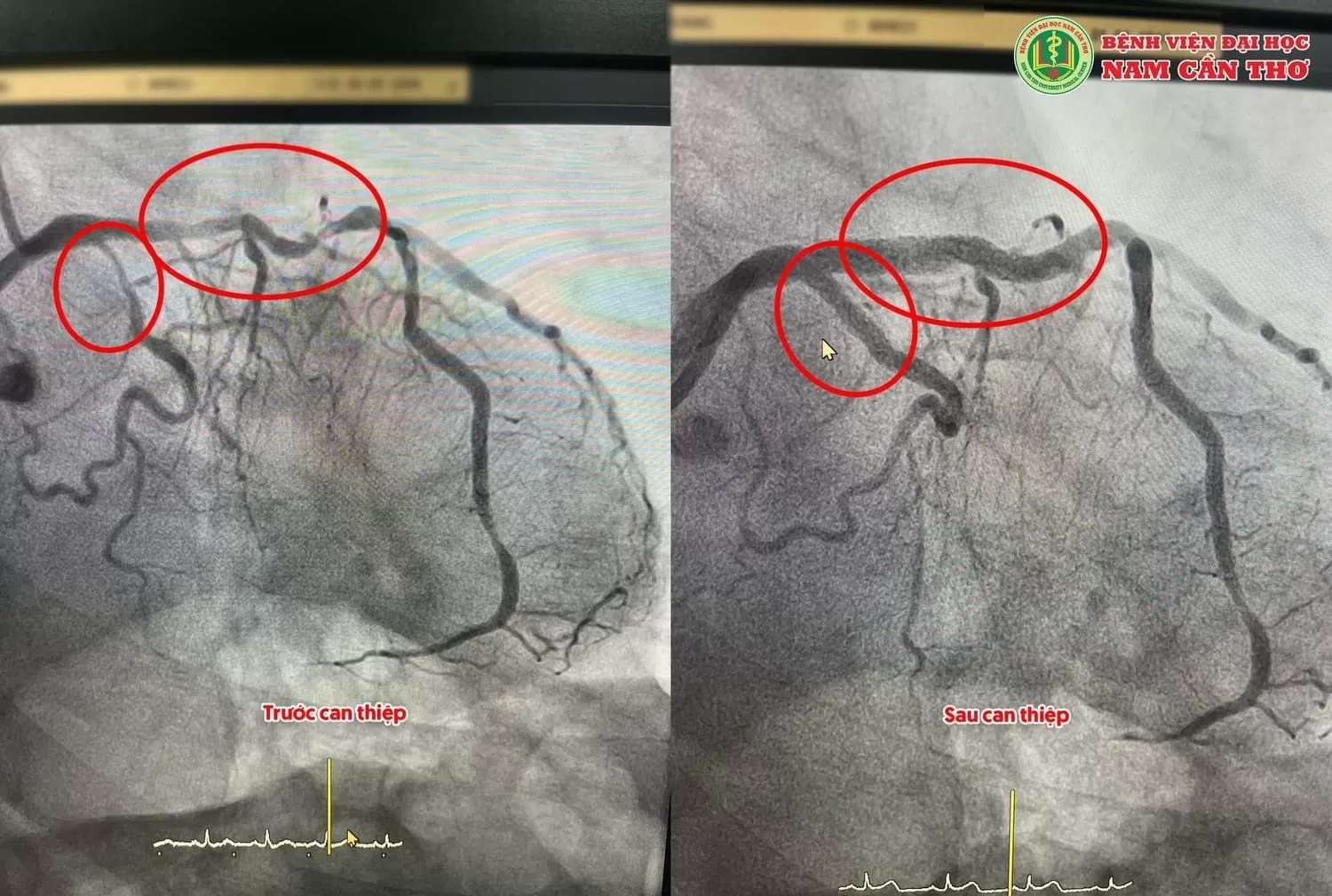 Còn trường hợp một bệnh nhân Nam 68 tuổi Bị nhồi máu cơ tim cấp, bệnh nhân bị hẹp nặng ngay gốc động mạch vành, hẹp nặng dài lan tỏa 2 nhánh chính động mạch vành, tình trạng rất nguy kịch, cũng được BS CKII Trần Chí Dũng và ekip can thiệp đặt 3 stent LM – LAD, LM-LCXI, LCxI-II mạch máu tái thông hoàn toàn, bệnh nhân đã qua cơ nguy kịch.