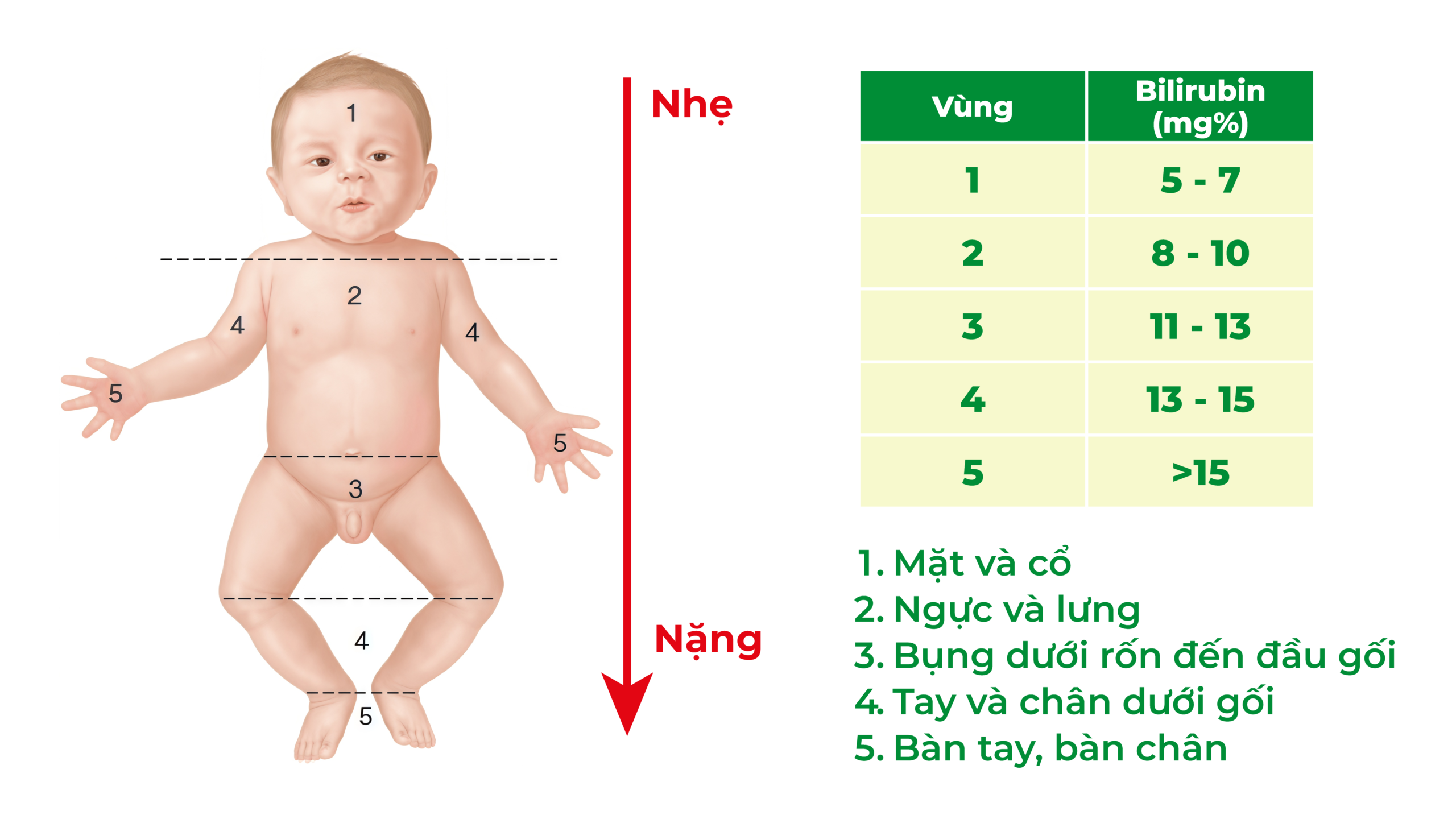 • Mức độ vàng da nhẹ (chỉ vàng da vùng mặt, cổ, ngực và vùng bụng phía trên rốn).