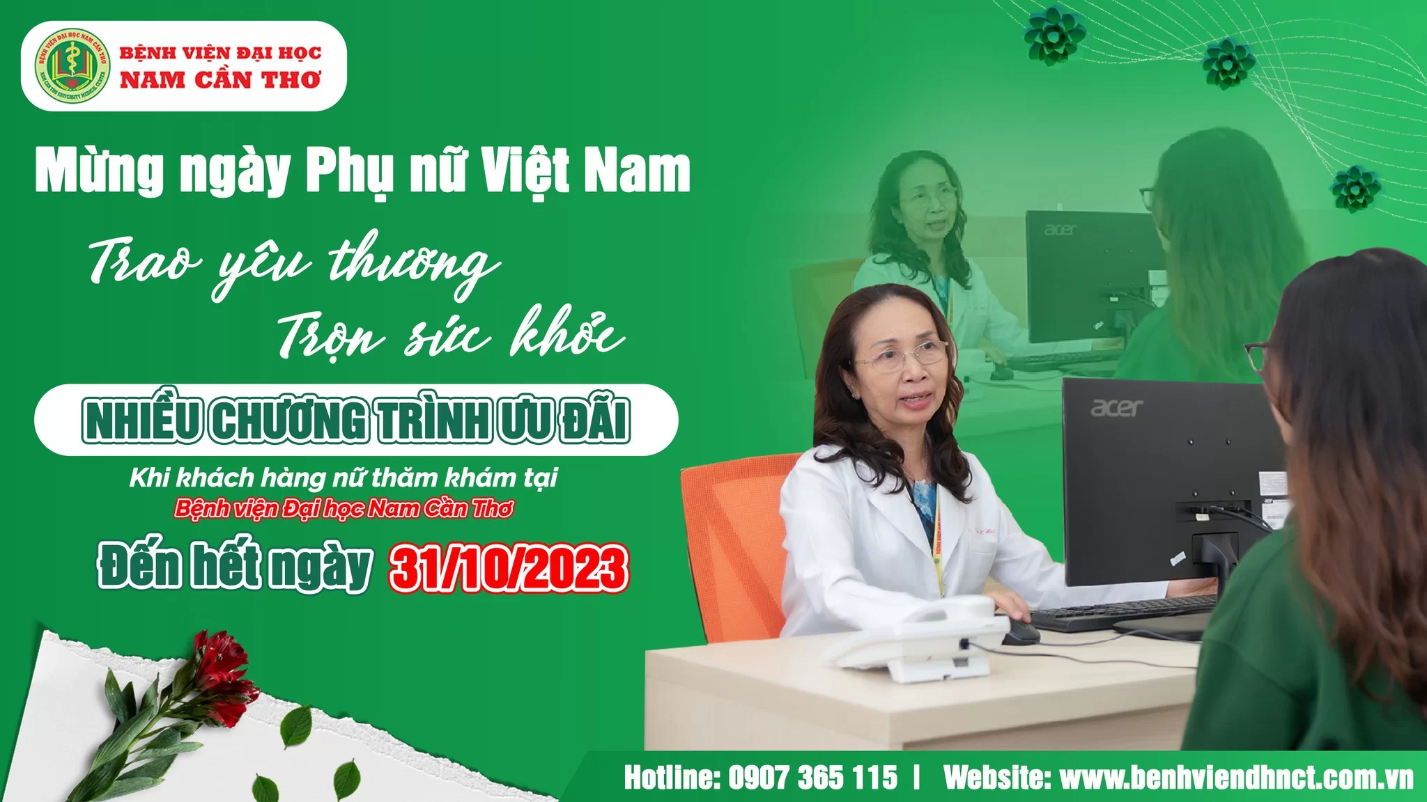 Tháng 10 – tháng tôn vinh người phụ nữ Việt Nam, dành tặng cho “một nữa” thế giới món quà tuyệt vời nhấ, Bệnh viện Đại học Nam Cần Thơ mang đến các ưu đãi dành riêng cho khách hàng nữ khi thăm khám và chăm sóc sức khỏe tại Bệnh viện.