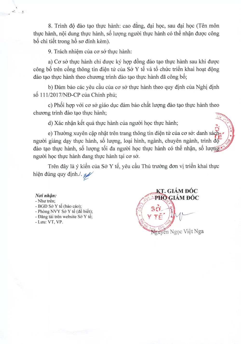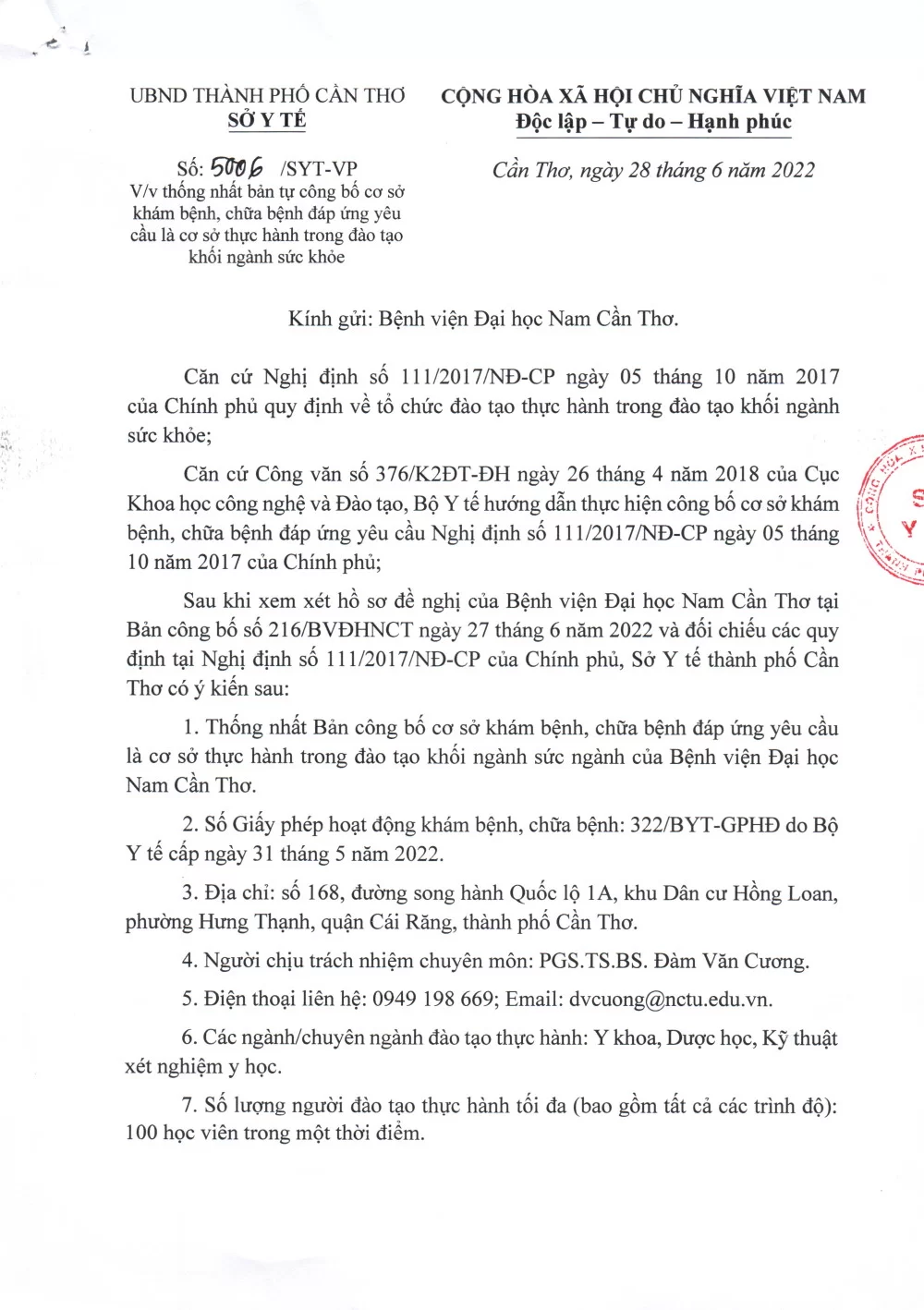 Công văn số 5006/SYT-VP của Sở y tế TP. Cần Thơ về việc thống nhất bản tự công bố cơ sở khám bệnh, chữa bệnh đáp ứng yêu cầu là cơ sở thực hành trong đào tạo khối ngành sức khỏe